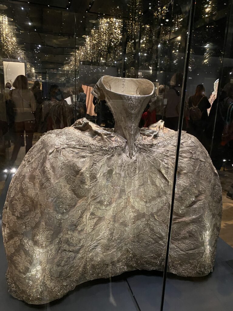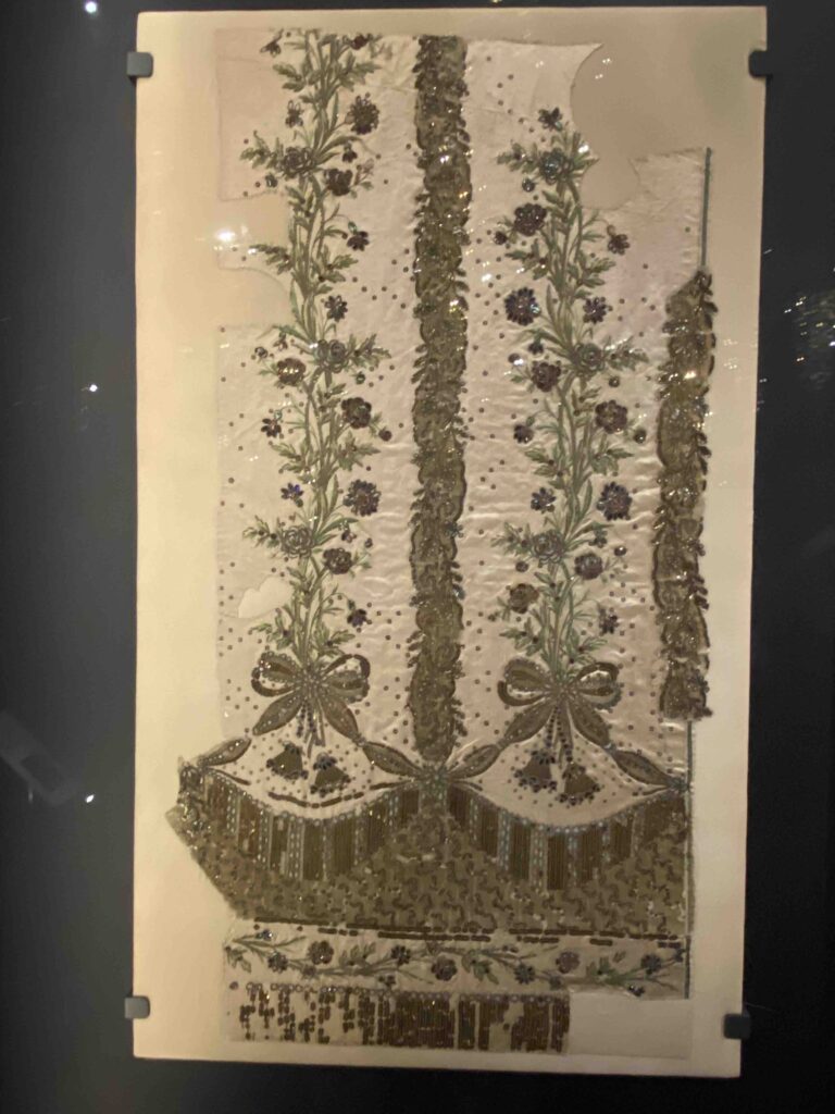 Alors que verrez-vous dans cette expo ? Pas de robes de Marie-Antoinette, il n’en existe malheureusement plus. Vous admirerez en revanche des fragments ayant supposément appartenu à ses robes ou des modèles très similaires à celles qu’elle aurait pu porter, tant dans la coupe (robe à la française, à la polonaise ou à l’anglaise) que dans le raffinement des matières.